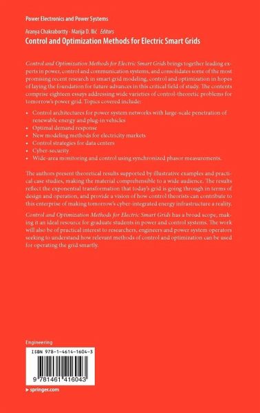 Control and Optimization Methods for Electric Smart Grids brings together leading experts in power, control and communication systems, and consolidates some of the most promising recent research in smart grid modeling, control and optimization in hopes of laying the foundation for future advances in this critical field of study. The contents comprise eighteen essays addressing wide varieties of control-theoretic problems for tomorrow's power grid. Topics covered include control architectures for power system networks with large-scale penetration of renewable energy and plug-in vehicles, optimal demand response, new modeling methods for electricity markets, cyber-security,data analysis and wide-area control using synchronized phasor measurements.