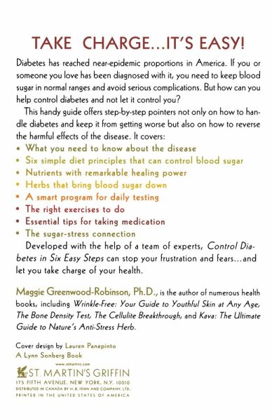 Take Charge...It's Easy! Diabetes has reached near-epidemic proportions in America. If you or someone you love has been diagnosed with it, you need to keep blood sugar in normal ranges and avoid serious complications. But how can you help control diabetes and not let it control you? This handy guide offers step-by-step pointers to not only handle diabetes and keep it from getting worse-but also to reverse the harmful effects of the disease. It covers: * What you need to know about the disease * Six simple diet principles that can control blood sugar! * Nutrients with remarkable healing power * Herbs that bring blood sugar down * A smart program for daily testing *The right exercises to do * Essential tips for taking medication * The sugar-stress connection Developed with the help of a team of experts, Control Diabetes in Six Easy Steps, can stop your frustration and fears...and let you take charge of your health. Learn The Truth About Diabetes... * Are there forbidden foods in diabetes therapy? See what few foods are off-limits-and be surprised! * What sugar substitute is not only non-caloric, all-natural, and 250 times sweeter than sugar? If you haven't heard of "stevia," it's time to get the facts! * How hard is it to change your diet? Find six "nothing-to-it" nutrition principles that make meals a cinch. * Can anything repair nerve damage (neuropathy)? Check out alpha lipoic acid...and the top ten nutrients for keeping you complication-free. * Exercise can bring you spectacular health benefits if you prepare. Find out how to protect your feet and keep your glucose from going crazy. * What is the effect of stress on diabetes? Negative emotions can send blood sugar skyrocketing...unless you know what to do. ...And More! Knowledge Is Your Best Weapon To Stop Diabetes