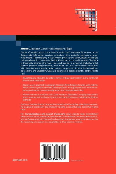"Control of Complex Systems: Structural Constraints and Uncertainty" focuses on control design under information structure constraints, with a particular emphasis on large-scale systems. The complexity of such systems poses serious computational challenges and severely restricts the types of feedback laws that can be used in practice. This book systematically addresses the main issues, and provides a number of applications that illustrate potential design methods, most which use Linear Matrix Inequalities (LMIs), which have become a popular design tool over the past two decades. Authors Aleksandar I. Zecevic and Dragoslav D. Siljak use their years of experience in the control field to also: