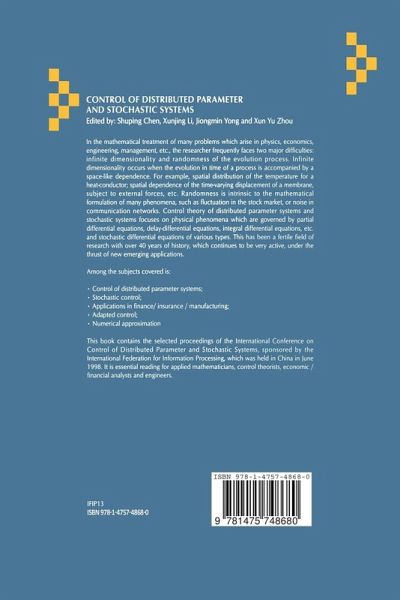 In the mathematical treatment of many problems which arise in physics, economics, engineering, management, etc., the researcher frequently faces two major difficulties: infinite dimensionality and randomness of the evolution process. Infinite dimensionality occurs when the evolution in time of a process is accompanied by a space-like dependence; for example, spatial distribution of the temperature for a heat-conductor, spatial dependence of the time-varying displacement of a membrane subject to external forces, etc. Randomness is intrinsic to the mathematical formulation of many phenomena, such as fluctuation in the stock market, or noise in communication networks. Control theory of distributed parameter systems and stochastic systems focuses on physical phenomena which are governed by partial differential equations, delay-differential equations, integral differential equations, etc., and stochastic differential equations of various types. This has been a fertile field of research with over 40 years of history, which continues to be very active under the thrust of new emerging applications.