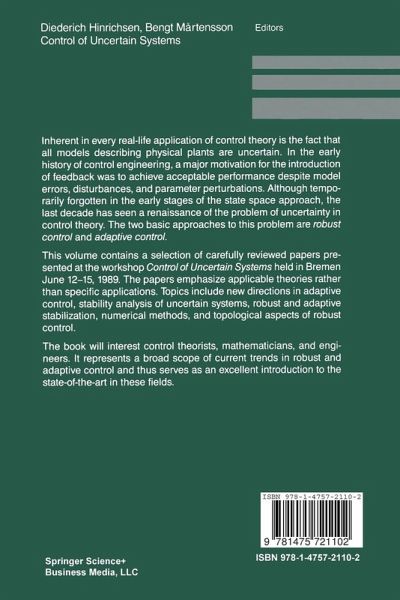 Invoking the machinery of Control Theory to control a real-world plant means, on the basis of available a priori knowledge of the plant, design ing/selecting a feasible controller accomplishing the control objective. A priori knowledge about the plant is normally represented as a mathemat ical model, given by physical laws or measurement data. Such a model is inevitably uncertain, due to measurement errors, simplified models of natural laws, neglected dynamics, and the desire to get a model tractable for further computations. Control of Uncertain Systems is therefore an im portant issue, both practically and philosophically. Basically, two different approaches exist: Adaptive Control and Robust Control. On four beautiful summer days in June 1989, researchers from 12 coun tries gathered together in Bremen, West Germany, for a workshop devoted to these issues. 49 talks, invited and contributed, were presented. The present work collects 18 of these talks. (Program and original abstracts from the workshop are available as Report 209, Institute for Dynamical System.) The papers represent a broad scope of current trends in robust and adaptive control. Topics covered include: New directions in adaptive control, stability analysis of uncertain systems, robust and adaptive stabi lization, numerical methods, and topological aspects of robust control. The papers were carefully refereed and we would like to thank the referees for their efforts, which have resulted in substantial improvements.
