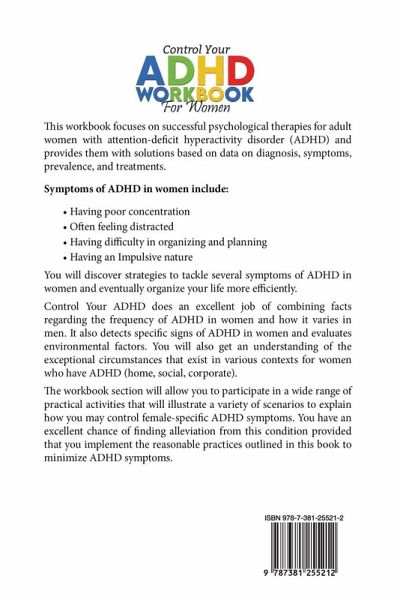 Women are as prone to ADHD as men, and the struggle with the symptoms is unending. Women are more prone to emotional imbalance, and ADHD worsens it. The good news is you can overcome your most frustrating symptoms of ADHD with more tailored assistance. Using this workbook, you can make your life more organized and successful by keeping the move-forward momentum and removing every obstacle that ADHD causes on your way to your best self. This workbook focuses on successful psychological therapies for adult women with attention-deficit hyperactivity disorder (ADHD) and provides them with solutions based on data on diagnosis, symptoms, prevalence, and treatments. Symptoms of ADHD in women include: Having poor concentration Often feeling distracted Having difficulty in organizing and planning Having an Impulsive nature The theoretical portion of the book covers essential aspects of ADHD in women. A clear understanding of the condition and unique facts about gender biases really make a massive difference in the diagnosis and treatment. The section includes the following: Gender biases and their impacts Prevalence of ADHD in women Subtypes of ADHD in females Female-specific ADHD assessments Phamacological and non-pharmacological treatments Executive functioning and ADHD Interventions in different settings (home, office, social places) The workbook section will allow you to participate in a wide range of practical activities that will illustrate a variety of scenarios to explain how you may control female-specific ADHD symptoms. You have an excellent chance of finding alleviation from this condition provided that you implement the reasonable practices outlined in this book to minimize ADHD symptoms.