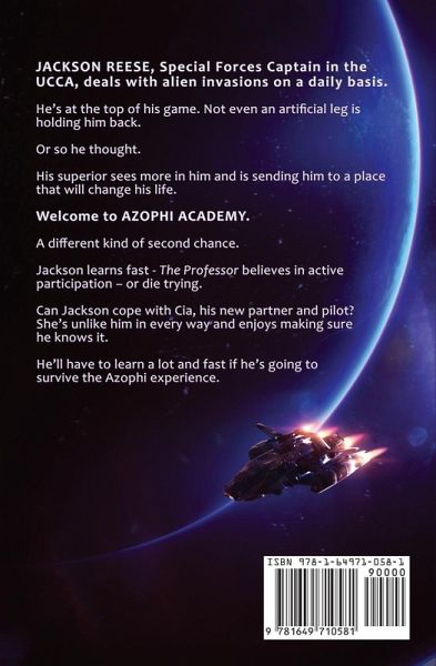 Jackson Reese, Special Forces Captain in the UCCA, deals with alien invasions on a daily basis. He's at the top of his game. Not even an artificial leg is holding him back. Or so he thought. His superior sees more in him and is sending him to a place that will change his life. Welcome to Azophi Academy. A different kind of second chance. Jackson learns fast - The Professor believes in active participation - or die trying. Can Jackson cope with Cia, his new partner and pilot? She's unlike him in every way and enjoys making sure he knows it. He'll have to learn a lot and fast if he's going to survive the Azophi experience. For fantastic technology, martial arts, and intrigue, join the Academy today! Scroll up and click the Buy Now button and read it today.