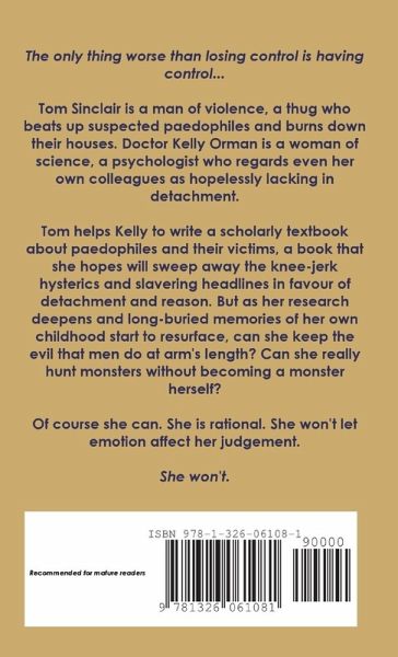The only thing worse than losing control is having control... Tom Sinclair is a man of violence, a thug who beats up suspected paedophiles and burns down their houses. Doctor Kelly Orman is a woman of science, a psychologist who regards even her own colleagues as hopelessly lacking in detachment. Tom helps Kelly to write a scholarly textbook about paedophiles and their victims, a book that she hopes will sweep away the knee-jerk hysterics and slavering headlines in favour of detachment and reason. But as her research deepens and long-buried memories of her own childhood start to resurface, can she keep the evil that men do at arm's length? Can she really hunt monsters without becoming a monster herself? Of course she can. She is rational. She won't let emotion affect her judgement. She won't.