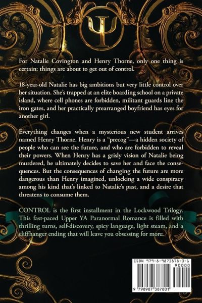 For Natalie Covington and Henry Thorne, only one thing is certain: things are about to get out of control. 18-year-old Natalie has big ambitions but very little control over her situation. She's trapped at an elite boarding school on a private island, where cell phones are forbidden, militant guards line the iron gates, and her practically prearranged boyfriend has eyes for another girl. Everything changes when a mysterious new student arrives named Henry Thorne. Henry is a "precog"-a hidden society of people who can see the future, and who are forbidden to reveal their powers. When Henry has a grisly vision of Natalie being murdered, he ultimately decides to save her and face the consequences. But the consequences of changing the future are more dangerous than Henry imagined, unlocking a wide conspiracy among his kind that's linked to Natalie's past, and a desire that threatens to consume them. CONTROL is the first installment in the Lockwood Trilogy. This fast-paced Upper YA Paranormal Romance is filled with thrilling turns, self-discovery, spicy language, light steam, and a cliffhanger ending that will leave you obsessing for more.