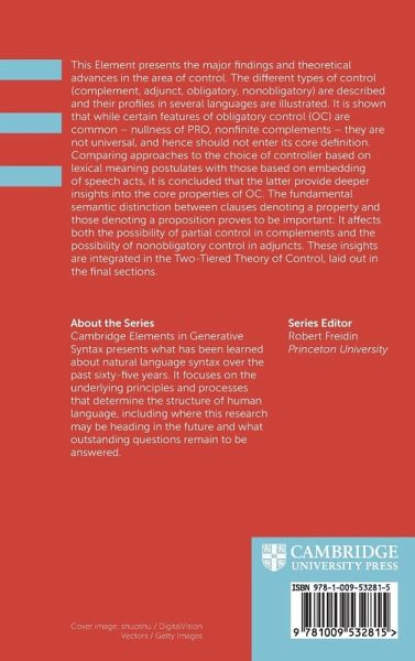 This Elements presents the major findings and theoretical advances in the area of Control. We describe the different types of control (complement, adjunct, obligatory, nonobligatory) and illustrate their profiles in several languages. It is shown that while certain features of Obligatory Control (OC) are common - nullness of PRO, nonfinite complements - they are not universal, hence should not enter its core definition. Comparing approaches to the choice of controller based on lexical meaning postulates with those based on embedding of speech acts, we conclude that the latter provide deeper insights into the core properties of OC. The fundamental semantic distinction between clauses denoting a property and those denoting a proposition proves to be important: It affects both the possibility of Partial Control in complements and the possibility of Non Obligatory Control in adjuncts. These insights are integrated in the Two-Tiered Theory of Control, laid out in the final sections.