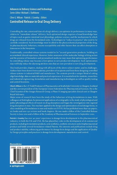 Introduction and History of Controlling Drug Release.- The Organization of the Gut and the Oral Absorption of Drugs: Anatomical, Biological and Physiological Considerations in Oral Formulation Development.- Controlling Drug Release in Oral Product Development Programs: An Industrial Perspective.- Animal Model Systems Suitable for Controlled Release Modeling.- In Vitro Testing of Controlled Release Dosage Forms during Development and Manufacture.- Oral Controlled Delivery Mechanisms and Technologies.- Drug-Polymer Matrices for Extended Release.- Ion Exchange Approaches to Controlling Drug Release.- Pulsatile Delivery for Controlling Drug Release.- Ordered Mesoporous Silica for the Delivery of Poorly Soluble Drugs.- Geometric Release Systems: Principles, Mechanisms, Kinetics, Polymer Science, Release Modifying Materials.- Extrudable Technologies for Controlling Drug Release and Absorption.- Coated Multiparticulates for Controlling Drug Release.- Capsules as a Delivery System for Modified Release Products.- Lipids in Oral Controlled Release Drug Delivery.- Buccal Drug Delivery.- Controlling Release by Gastro Retention.- Drug Delivery to the Colon.