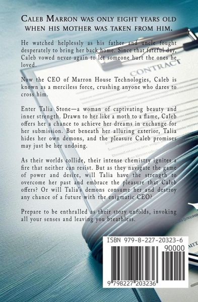 Caleb Marron was only eight years old when his mother was taken from him. He watched helplessly as his father and uncle fought desperately to bring her back home. Since that fateful day, Caleb vowed never again to let someone hurt the ones he loved. Now the CEO of Marron House Technologies, Caleb is known as a merciless force, crushing anyone who dares to cross him. Enter Talia Stone-a woman of captivating beauty and inner strength. Drawn to her like a moth to a flame, Caleb offers her a chance to achieve her dreams in exchange for her submission. But beneath her alluring exterior, Talia hides her own demons, and the pleasure Caleb promises may just be her undoing. As their worlds collide, their intense chemistry ignites a fire that neither can resist. But as they navigate the game of power and desire, will Talia have the strength to overcome her past and embrace the pleasure that Caleb offers? Or will Talia's demons consume her and destroy any chance of a future with the enigmatic CEO? Prepare to be enthralled as their story unfolds, invoking all your senses and leaving you breathless.