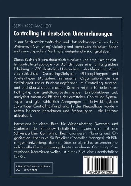 Ausgangspunkt der vorliegenden Untersuchung stellt die aufierordentlich gro6e Vielfalt unterschiedlicher Definitionen, Konzeptionen, Ansiitze, Paradigmen, Auf fassungen, Denkmodelle, Betriebsmodelle u. ii. im Controlling dar, die der Ver fasser zu Recht als ,.Controlling-Dschungel" bezeichnet. Aufgrund der damit ver bundenen Unterschiedlichkeit ist bis heute weitgehend unklar geblieben, durch welche ,.typischen Merkmale" das Controlling gekennzeichnet werden kann. Das zentrale Ziel der Studie von meinem SchUler und Mitarbeiter, Herro Bernhard Amshoff, besteht daher in der theoriegeleiteten Entwicklung einer empirisch gestiitzten Controlling Typologie. Ein solcher typologischer Ansatz in der hier vorliegenden Form ist weder in der deutschsprachigen noch in der intemationalen Controlling-Forschung weder auf theoretisch-konzeptioneller noch auf empirischer Ebene verfolgt worden. Der Arbeit liegt eine umfangreiche und sehr solide empirische Datenbasis zugrunde: Es wurde an slimtlicheUntemehmungen in der (alten) Bundesrepublik Deutschland (einschlie6Iich West-Berlin) mit einer Beschiifti~tenzahl von ~ 500 ohne die Bran chen Land- und Forstwirtschaft, Fischerei und Tierhaltung, Handelsvermittlung, Kredit- und sonstige Finanzierungsinstitute, Versicherungsgewerbe und Dienstlei stungen ein sehr aussageflihiger, yom Autor sorgfaItig entwickelter und pregeteste ter Fragebogen verschickt (= 2.521 Untemehmungen). Es konnten 320 FragebOgen zur Controlling-Gestaltung und 292 FragebOgen zur Controlling-Effizienz in die Auswertung einbezogen werden. Der Riicklauf kann im Vergleich zu anderen gro6en Erhebungen als gut betrachtet werden und reflektiert die Struktur der (vermutlichen) Grundgesamtheit.