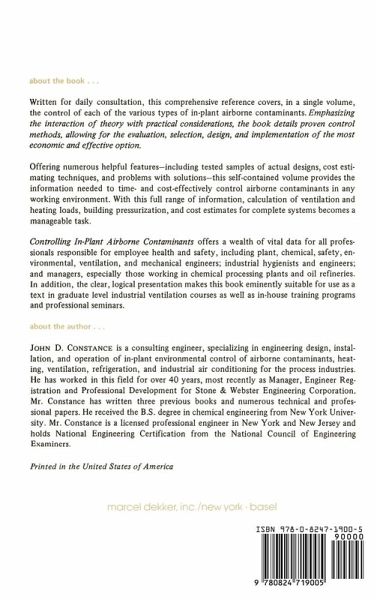1. Theory in Practice 2. Identifying Sources of air Contaminants 3. Plant Layout and Classification of Hazardous Areas 4. Natural Ventilation 5. Control by Mechanical Ventilation 6. Local Exhaust Ventilation 7. Makeup air Systems 8. Dust Control in the Workplace 9. Designing for Pressure Ventilation 10. Clearing the air in Laboratories for Safety and Health 11. Moisture Control in Process Buildings 12. Think Quiet-Desigh for Noise Control in Industry 13. Industrial Heat and its Control