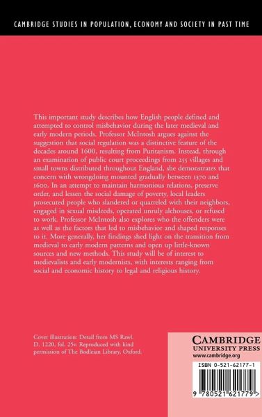 In this important study, Professor McIntosh argues against the suggestion that social regulation was a distinctive feature of the decades around 1600, resulting from Puritanism. Instead, through an examination of 255 village and small-town communities distributed throughout England, Professor McIntosh demonstrates that concern with wrongdoing mounted gradually between 1370 and 1600. In an attempt to maintain good order and enforce ethical conduct, local leaders prosecuted people who slandered or quarrelled with their neighbours, engaged in sexual misdeeds, operated unruly alehouses, or refused to work. Professor McIntosh also explores who the offenders were as well as the factors that led to misbehaviour and shaped responses to it. More generally, Professor McIntosh sheds light on the transition from medieval to early modern patterns and succeeds here in opening up little-known sources and new research methods.