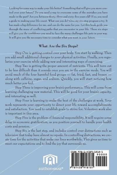 Who Should Read This Book Looking for some way to make your life better? Something that will give you more control over your future? Do you need a way to overcome some of the mistakes you have made in the past? Are you between thirty-three and sixty-five years old? If so, you need a guide to making your life count. What can you do? Give my six-step program a try. It has made a big difference for me, and can do the same for you. Let this book guide you through the maze of conflicting paths that you encounter in your life. These six steps will give you the confidence you need to face the many challenges life puts in your way. It will give you the necessary time to consider what you want in your future. What Are the Six Steps? Step One is getting control over you body. You start by walking. Then you add small additional changes to your physical activities. Finally, you regularize your exercise while adding new and interesting ways of exercising. Step Two is getting the proper amount of nutrients. This will turn out to be less difficult than it sounds once you are in the exercise mode. You will avoid much of the four harmful food groups - fat, fried, fast, and frozen - along with caffeine, sugar, and sodium. Quickly, you will start noticing how much better you feel. Step Three is improving your brain's performance. This will come from learning challenging new material. This will be good for your brain's capacity, and interesting as well. Step Four is learning to make the best of the challenges at work. Your work represents your opportunity to direct your life toward accomplishments and satisfaction. You need to establish goals to strive for. Volunteer work also is important in this area. Step Five is the problem of financial responsibility. It will require some delay in economic gratification, as you position yourself to handle your health costs and pension. Step Six is the last step, and includes control over distractions such as television that today have almost no upside. In controlling distractions, we create time for the activities that make our lives worthwhile. This gives us time to meet our expectations and to find the joy that surrounds us.