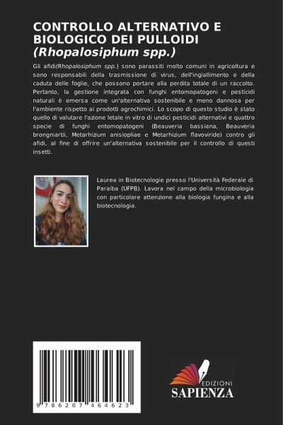 Gli afidi(Rhopalosiphum spp.) sono parassiti molto comuni in agricoltura e sono responsabili della trasmissione di virus, dell'ingiallimento e della caduta delle foglie, che possono portare alla perdita totale di un raccolto. Pertanto, la gestione integrata con funghi entomopatogeni e pesticidi naturali è emersa come un'alternativa sostenibile e meno dannosa per l'ambiente rispetto ai prodotti agrochimici. Lo scopo di questo studio è stato quello di valutare l'azione letale in vitro di undici pesticidi alternativi e quattro specie di funghi entomopatogeni (Beauveria bassiana, Beauveria brongniartii, Metarhizium anisiopliae e Metarhizium flavoviride) contro gli afidi, al fine di offrire un'alternativa sostenibile per il controllo di questi insetti.