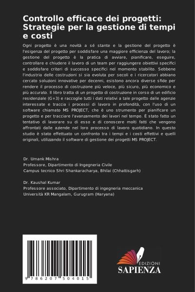 Ogni progetto è una novità a sé stante e la gestione del progetto è l'esigenza del progetto per soddisfare una maggiore efficienza del lavoro; la gestione del progetto è la pratica di avviare, pianificare, eseguire, controllare e chiudere il lavoro di un team per raggiungere obiettivi specifici e soddisfare criteri di successo specifici nel momento stabilito. Sebbene l'industria delle costruzioni si sia evoluta per secoli e i ricercatori abbiano cercato soluzioni innovative per decenni, esistono ancora diverse sfide per rendere il processo di costruzione più veloce, più sicuro, più economico e più accurato. Il libro tratta di un progetto di costruzione in corso di un edificio residenziale (G+3) e raccoglie tutti i dati relativi a tale progetto dalle agenzie interessate e traccia i processi di lavoro in profondità, con l'uso di un software chiamato MS PROJECT, che è uno strumento per pianificare un progetto e per tracciare l'avanzamento dei lavori nel tempo. È stato fatto un tentativo di lavorare su di esso e di conoscere molti fatti che vengono affrontati dalle aziende nel loro processo di lavoro quotidiano. In questo studio è stato effettuato un confronto tra i tempi e i costi effettivi e quelli originali, utilizzando il software di gestione dei progetti MS PROJECT.