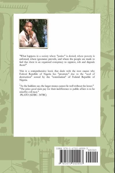 "What happens in a society where "justice" is denied, where poverty is enforced, where ignorance prevails, and where the people are made to feel that there is an organised conspiracy to oppress, rob and degrade them?" This is a comprehensive book that deals with the "root causes" why Federal Republic of Nigeria lies "prostrate" due to the "seed of destruction" sowed by the "constitution" of Federal Republic of Nigeria. "As the builders say; the larger stones cannot lie well without the lesser." "The price good men pay for their indifference to public affairs is to be ruled by evil men." -PLATO (423BC- 347BC)