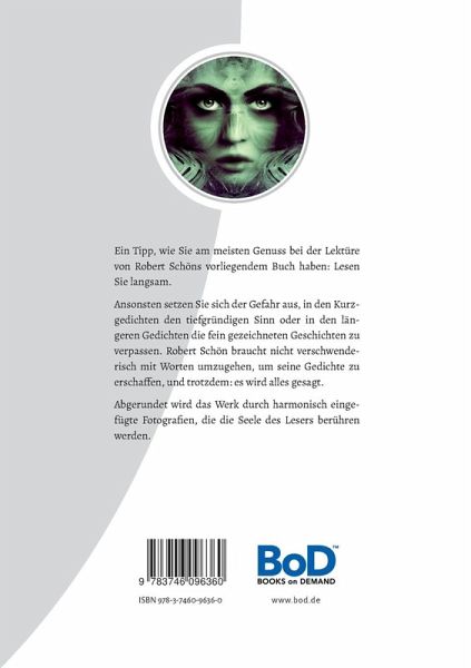 Ein Tipp, wie Sie am meisten Genuss bei der Lektüre von Robert Schöns vorliegendem Buch haben: Lesen Sie langsam.Ansonsten setzen Sie sich der Gefahr aus, in den Kurzgedichten den tiefgründigen Sinn oder in den längeren Gedichten die fein gezeichneten Geschichten zu verpassen. Robert Schön braucht nicht verschwenderisch mit Worten umzugehen, um seine Gedichte zu erschaffen, und trotzdem: es wird alles gesagt.Abgerundet wird das Werk durch harmonisch eingefügte Fotografien, die die Seele des Lesers berühren werden.