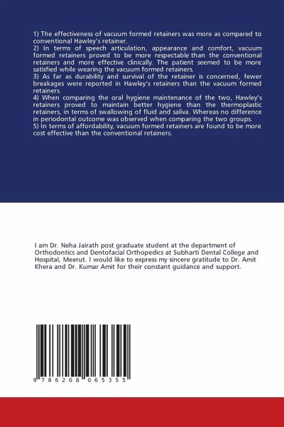 1) The effectiveness of vacuum formed retainers was more as compared to conventional Hawley's retainer.2) In terms of speech articulation, appearance and comfort, vacuum formed retainers proved to be more respectable than the conventional retainers and more effective clinically. The patient seemed to be more satisfied while wearing the vacuum formed retainers.3) As far as durability and survival of the retainer is concerned, fewer breakages were reported in Hawley's retainers than the vacuum formed retainers.4) When comparing the oral hygiene maintenance of the two, Hawley's retainers proved to maintain better hygiene than the thermoplastic retainers, in terms of swallowing of fluid and saliva. Whereas no difference in periodontal outcome was observed when comparing the two groups.5) In terms of affordability, vacuum formed retainers are found to be more cost effective than the conventional retainers.