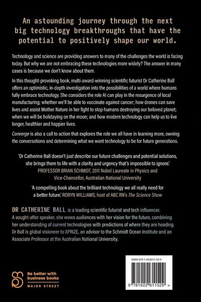 An astounding journey through the next big technology breakthroughs that have the potential to positively shape our world. Technology and science are providing answers to many of the challenges the world is facing today. But why we are not embracing these technologies more widely? The answer in many cases is because we don't know about them. In this thought-provoking book, multi-award-winning scientific futurist Dr Catherine Ball offers an optimistic, in-depth investigation into the possibilities of a world where humans fully embrace technology. She considers the role AI can play in the resurgence of local manufacturing; whether we'll be able to vaccinate against cancer; how drones can save lives and assist Mother Nature in her fight to stop humans destroying our beloved planet; when we will be holidaying on the moon; and how modern technology can help us to live longer, healthier and happier lives. Converge is also a call to action that explores the role we all have in learning more, owning the conversations and determining what we want technology to be for future generations.