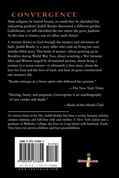 Judith Bruder, like so many women, has lived a variety of lives, often to her own astonishment.On college campuses she is a writer, a lecturer, and a scholar; a graduate of Wellesley College who has been a campus minister at Fordham University in Manhattan. At home she is a wife, mother, grandmother, and most recently, an unwilling widow. Brooklyn-born and Long Island bred, Judy loves foreign languages, knows a smattering of many, and feels at home around the world. Her interests range from English Literature and addictions counseling to cooking techniques, French conversation, mystery novels and the movies.Judy knows two religious traditions from the inside out. She was raised as a devout, believing Jew. Her first novel, Going to Jerusalem (Simon & Schuster, 1979), offered a funny, quirky, modern-day Jewish pilgrimage to the land of Israel. Then the unthinkable happened, as she found herself unexpectedly and irrevocably embarking on a spiritual journey that eventually led her to become a Roman Catholic.She told that story in her second book, Convergence (Doubleday, 1992), about which Book-of-the-Month Club wrote: "Moving, funny, and poignant, Convergence is an autobiography of rare candor and depth."Currently Judy is dwelling in the Country of Old, in a retirement community in the Pioneer Valley of Massachusetts. She rarely ventures beyond it, but gratefully and delightedly receives many visitors, old friends and new, a modern-day anchoress, or so it pleases her to think. She has also been freshly revitalized by the addition of a great-granddaughter, Casey, who is a pistol!