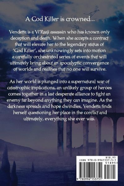 A God Killer is crowned... Vendetta is a Vi'Raaji assassin who has known only deception and death. When she accepts a deadly contract that will elevate her to the legendary status of 'God Killer', she unknowingly sets into motion a carefully orchestrated series of events that will ultimately bring about an apocalyptic convergence of worlds and realities that no one will survive. As her world is plunged into a supernatural war of catastrophic implications, an unlikely group of heroes comes together in a last desperate alliance to fight an enemy far beyond anything they can imagine. As the darkness spreads and hope dwindles, Vendetta finds herself questioning her place in the conflict and ultimately, everything she ever was.