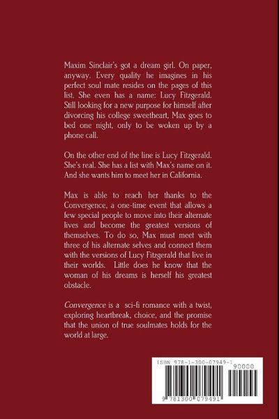 Maxim Sinclair's got a dream girl. On paper, anyway. Every quality he imagines in his perfect soul mate resides on the pages of this list. She even has a name: Lucy Fitzgerald. Still looking for a new purpose for himself after divorcing his college sweetheart, Max goes to bed one night, only to be woken up by a phone call. On the other end of the line is Lucy Fitzgerald. She's real. She has a list with Max's name on it. And she wants him to meet her in California. Max is able to reach her thanks to the Convergence, a one-time event that allows a few special people to move into their alternate lives and become the greatest versions of themselves. To do so, Max must meet with three of his alternate selves and connect them with the versions of Lucy Fitzgerald that live in their worlds. Little does he know that the woman of his dreams is herself his greatest obstacle.