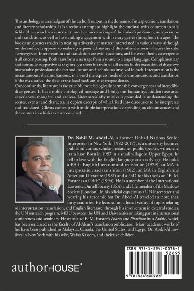 This anthology constitutes an amalgam of the author's output in the domains of interpretation, translation, and literary criticism over the years. It is a serious attempt to highlight the cardinal traits they have in common. This research reflects my personal vested trek into the inner workings of my current breadwinning profession (interpretation and translation), as well as my continuing and standing engagement with literary genres throughout the ages. Its uniqueness stems from the premise that it contains matters interrelated in more ways than one, although on the surface it appears to make up a queer admixture of different elements-hence the title, Convergences. Interpretation and translation are twin vocations, and between them, convergence is all encompassing. They are complementary and mutually supportive; they do not clash but overlap, indeed reinforce each other. Interpretation is the instantaneous, the simultaneous, in a word the express mode of communication; and translation is the meditative, the slow or the local medium of correspondence. They perform the same task of transforming a message from a source to a target language. However, there is a train of difference in the method of practicing these two inseparable professions: the mechanism used in performing them as well as in bringing the final product out to the clients for consumption. Literature, on the other hand, is the crucible for all types of teleologically permeable convergences and incredible divergences. It has a noble ontological message and brings out humanity's hidden treasures, experiences, thoughts, and choices. It also portrays people's elusive emotions, misery, happiness, social phenomena, and ticklish domestic affairs. The factual intent behind literature's lofty missive is grounded in understanding the scenes, events, and characters it depicts. This in turn revolves around the multiple interpretations that they elicit from the readership in general. As a matter of course, literary topics lend themselves to a bonanza of interpretations-fictional, religious, lexical-depending on their surrounding circumstances and the context in which the texts are couched.