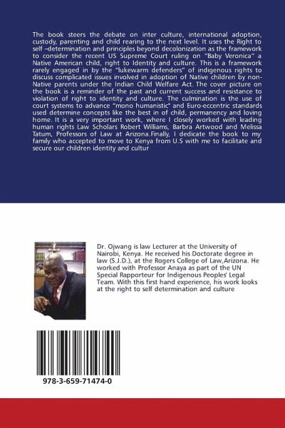 The book steers the debate on inter culture, international adoption, custody, parenting and child rearing to the next level. It uses the Right to self -determination and principles beyond decolonization as the framework to consider the recent US Supreme Court ruling on "Baby Veronica" a Native American child, right to Identity and culture. This is a framework rarely engaged in by the "lukewarm defenders" of indigenous rights to discuss complicated issues involved in adoption of Native children by non-Native parents under the Indian Child Welfare Act. The cover picture on the book is a reminder of the past and current success and resistance to violation of right to identity and culture. The culmination is the use of court systems to advance "mono humanistic" and Euro-eccentric standards used determine concepts like the best in of child, permanency and loving home. It is a very important work, where I closely worked with leading human rights Law Scholars Robert Williams, Barbra Artwood and Melissa Tatum, Professors of Law at Arizona.Finally, I dedicate the book to my family who accepted to move to Kenya from U.S with me to facilitate and secure our children identity and cultur