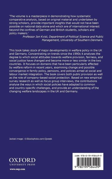 This book takes stock of major and recent developments in welfare policy in the UK and Germany. Concentrating on trends since the 1990s it compares the similarities and differences between the two countries and analyses the degree to which social attitudes towards welfare provision, fairness, and social justice have changed. It focuses on the policy areas that have been particularly affected in recent years and examines change and possible convergence across three public policy domains: family policy, pensions and policies aimed at social and labour market integration. The book covers both public provision as well as the role of company-based social protection. Based on new empirical survey research as well as focus group interviews, the contributions analyse the ways in which social policies have adapted to common and country-specific challenges, and provide an understanding of the changing welfare landscapes in the UK and Germany.