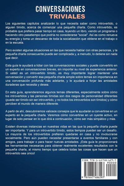 Si teme iniciar una charla y se siente incómodo al no saber qué decir, continúe leyendo… ¿Está cansado de no poder entablar una charla sin tornarse complicada y aburrida? ¿Ha intentado actuar de manera más extrovertida, pero nada parece funcionar durante más de unas pocas semanas? ¿Finalmente desea despedirse de su nerviosismo conociendo gente nueva y descubrir algo que funcione para usted? Si es así, entonces ha venido al lugar correcto. Verá, participar cómodamente en pequeñas charlas no tiene que ser difícil. Incluso si intentó imitar los modales de su amigo extrovertido y fracasó. Como puede entender, las pequeñas charlas son una herramienta poderosa y subestimada para la construcción de relaciones. Y lo mejor de todo, es una habilidad que puede aprender, lo que significa que incluso si usted es un introvertido tímido, puede volverse experto en las pequeñas charlas. A continuación, encontrará una pequeña fracción de lo que descubrirá en este libro: Una habilidad que le facilitará conversar Una de las peores cosas que puede hacer al participar en pequeñas charlas Cómo mantener una conversación interesante Consejos para iniciar una conversación y mantenerla activa 2 cosas que puede hacer en este instante para volverse más simpático Cómo iniciar y construir relaciones siendo introvertido 7 consejos para aumentar sus habilidades de comunicación 5 aspectos que debe buscar en el lenguaje corporal de las personas con las que habla 9 tácticas para desarrollar sus habilidades sociales ¡Y mucho, mucho más! Tómese un segundo para imaginar cómo se sentirá una vez que pueda mantener las conversaciones con facilidad y cómo reaccionarán sus familiares y amigos cuando lo vean hablar sin esfuerzo con desconocidos. Por lo tanto, incluso si usted es un introvertido tímido que rara vez habla con la gente, puede ser experto en las pequeñas charlas si aprende y aplica las estrategias de este libro. ¡Obtenga ahora este libro para obtener más información sobre las pequeñas charlas!