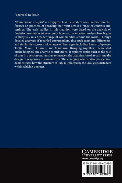 'Conversation analysis' is an approach to the study of social interaction that focuses on practices of speaking that recur across a range of contexts and settings. The early studies in this tradition were based on the analysis of English conversation. More recently, however, conversation analysts have begun to study talk in a broader range of communities around the world. Through detailed analyses of recorded conversations, this book examines differences and similarities across a wide range of languages including Finnish, Japanese, Tzeltal Mayan, Russian and Mandarin. Bringing together interrelated methodological and analytic contributions, it explores topics such as the role of gaze in question-and-answer sequences, the organization of repair, and the design of responses to assessments. The emerging comparative perspective demonstrates how the structure of talk is inflected by the local circumstances within which it operates.