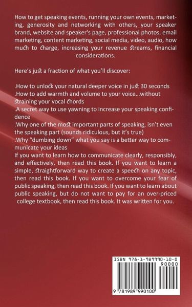 How to get speaking events, running your own events, marketing, generosity and networking with others, your speaker brand, website and speaker's page, professional photos, email marketing, content marketing, social media, video, audio, how much to charge, increasing your revenue streams, financial considerations. Here's just a fraction of what you'll discover: How to unlock your natural deeper voice in just 30 seconds How to add warmth and volume to your voice...without straining your vocal chords A secret way to use yawning to increase your speaking confidence Why one of the most important parts of speaking, isn't even the speaking part (sounds ridiculous, but it's true) Why "dumbing down" what you say is a better way to communicate your ideas If you want to learn how to communicate clearly, responsibly, and effectively, then read this book. If you want to learn a simple, straightforward way to create a speech on any topic, then read this book. If you want to overcome your fear of public speaking, then read this book. If you want to learn about public speaking, but do not want to pay for an over-priced college textbook, then read this book. It was written for you.