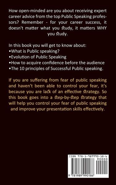 How open-minded are you about receiving expert career advice from the top Public Speaking professors? Remember - for your career success, it doesn't matter what you study, it matters WHY you study. In this book you will get to know about: ¿ ¿What is Public speaking? ¿Evolution of Public Speaking ¿How to acquire confidence before the audience ¿The 10 principles of Successful Public speaking. If you are suffering from fear of public speaking and haven't been able to control your fear, it's because you are lack of an effective strategy. So this book goes into a step-by-step strategy that will help you control your fear of public speaking and improve your presentation skills effectively.