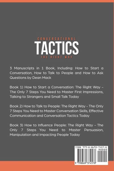 3 Manuscripts in 1 Book, Including: How to Start a Conversation, How to Talk to People and How to Ask Questions! Book 1) How to Start a Conversation: The Right Way - The Only 7 Steps You Need to Master First Impressions, Talking to Strangers and Small Talk Today Book 2) How to Talk to People: The Right Way - The Only 7 Steps You Need to Master Conversation Skills, Effective Communication and Conversation Tactics Today Book 3) How to Ask Questions: The Right Way - The Only 7 Steps You Need to Master Inquiry Communication Skills, Solving Problems and Getting the Right Answers Today You have made an excellent decision by choosing to learn more about conversation tactics. So, don't delay it any longer. Order "Conversation Tactics" Now!