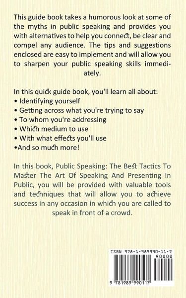 This guide book takes a humorous look at some of the myths in public speaking and provides you with alternatives to help you connect, be clear and compel any audience. The tips and suggestions enclosed are easy to implement and will allow you to sharpen your public speaking skills immediately. In this quick guide book, you'll learn all about: Identifying yourself Getting across what you're trying to say To whom you're addressing Which medium to use With what effects you'll use And so much more! In this book, Public Speaking: The Best Tactics To Master The Art Of Speaking And Presenting In Public, you will be provided with valuable tools and techniques that will allow you to achieve success in any occasion in which you are called to speak in front of a crowd.