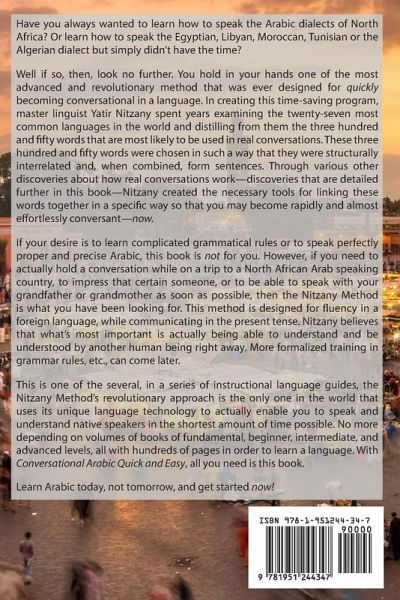 THIS BOOK DOESN'T CONTAIN ANY ARABIC LETTERS! ALL ARABIC WORDS IN THIS BOOK WERE WRITTEN IN ENGLISH-TRANSLITERATION! Have you always wanted to learn how to speak the Arabic dialects of North Africa? Or learn how to speak the Egyptian, Libyan, Moroccan, Tunisian or the Algerian dialect but simply didn't have the time? Well if so, then, look no further. You can hold in your hands one of the most advanced and revolutionary method that was ever designed for quickly becoming conversational in a language. In creating this time-saving program, master linguist Yatir Nitzany spent years examining the twenty-seven most common languages in the world and distilling from them the three hundred and fifty words that are most likely to be used in real conversations. These three hundred and fifty words were chosen in such a way that they were structurally interrelated and, when combined, form sentences. Through various other discoveries about how real conversations work--discoveries that are detailed further in this book--Nitzany created the necessary tools for linking these words together in a specific way so that you may become rapidly and almost effortlessly conversant--now. If your desire is to learn complicated grammatical rules or to speak perfectly proper and precise Arabic, this book is not for you. However, if you need to actually hold a conversation while on a trip to a North African Arab speaking country, to impress that certain someone, or to be able to speak with your grandfather or grandmother as soon as possible, then the Nitzany Method is what you have been looking for. This method is designed for fluency in a foreign language, while communicating in the present tense. Nitzany believes that what's most important is actually being able to understand and be understood by another human being right away. More formalized training in grammar rules, etc., can come later. This is one of the several, in a series of instructional language guides, the Nitzany Method's revolutionary approach is the only one in the world that uses its unique language technology to actually enable you to speak and understand native speakers in the shortest amount of time possible. No more depending on volumes of books of fundamental, beginner, intermediate, and advanced levels, all with hundreds of pages in order to learn a language. With Conversational Arabic Quick and Easy, all you need is this book. Learn North African Arabic today, not tomorrow, and get started now!