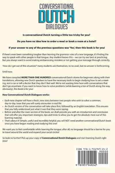 Is conversational Dutch turning a little too tricky for you? Do you have no idea how to order a meal or book a room at a hotel? If your answer to any of the previous questions was 'Yes', then this book is for you! If there's even been something tougher than learning the grammar rules of a new language, it's finding the way to speak with other people in that tongue. Any student knows this - we can try our best at practicing, but you always want to avoid making embarrassing mistakes or not getting your message through correctly. 'How do I get out of this situation?' many students ask themselves, to no avail, but no answer is forthcoming. Until now. We have compiled MORE THAN ONE HUNDRED conversational Dutch stories for beginners along with their translations, allowing new Dutch speakers to have the necessary tools to begin studying how to set a meeting, rent a car or tell a doctor that they don't feel well. We're not wasting time here with conversations that don't go anywhere: if you want to know how to solve problems (while learning a ton of Dutch along the way, obviously), this book is for you! How Conversational Dutch Dialogues works: · Each new chapter will have a fresh, new story between two people who wish to solve a common, day-to-day issue that you will surely encounter in real life.· An Dutch version of the conversation will take place first, followed by an English translation. This ensures that you fully understood just what it was that they were saying.· Before and after the main section of the book, we shall provide you with an introduction and conclusion that will offer you important strategies, tips and tricks to allow you to get the absolute most out of this learning material.· That's about it! Simple, useful and incredibly helpful; you will NOT need another conversational Dutch book once you have begun reading and studying this one! We want you to feel comfortable while learning the tongue; after all, no language should be a barrier for you to travel around the world and expand your social circles! So look no further! Pick up your copy of Conversational Dutch Dialogues and start learning Dutch right now!