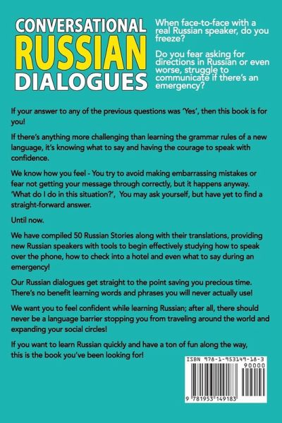 When face-to-face with a real Russian speaker, do you freeze? Do you fear not knowing how to ask for directions in Russian or even worse, struggle to communicate if there's an emergency? If your answer to any of the previous questions was 'Yes', then this book is for you! If there's anything more challenging than learning the grammar rules of a new language, it's knowing what to say and having the courage to speak with confidence. We know how you feel - You always try to avoid making embarrassing mistakes or not getting your message through correctly, but it will happen anyway. 'How do I get out of this situation?', You may ask yourself, but have yet to find a straight-forward answer. Until now. We have compiled 50 Russian Stories along with their translations, providing new Russian speakers with the necessary tools to begin effectively studying how to set a meeting, how to check into a hotel and even what to say during an emergency! Our Russian dialogues get straight to the point saving you precious time. There's no benefit learning words and phrases you will never actually use! If you want to learn Russian quickly and have a ton of fun along the way, this is the book you have been looking for! How Conversational Russian Dialogues works:Each new chapter will have a fresh, new story between two or more people who wish to solve a common, day-to-day problem that you will most likely experience in real life. A Russian version of the conversation will take place first, followed by an English translation. This ensures that you fully understood just what it was that they were saying! Before and after the main section of the book, we shall provide you with an introduction and conclusion that will offer you important strategies, tips and tricks to allow you to get the absolute most out of this learning material. That's about it! Simple, useful and incredibly helpful; you will NOT need another conversational Russian book once you have started reading and studying this one! Focus on getting from zero to conversationally fluent, so you can:Travel or live in Russia or any Russian speaking country without relying on Google Translate Join Russian conversations with your Russian speaking coworkers, friends, or family members Date Russian-speakers without embarrassing yourself Stop getting passed over for jobs or promotions for less-qualified people who are bilingual We want you to feel confident while learning Russian; after all, there should never be a language barrier stopping you from traveling around the world and expanding your social circles! So look no further! Scroll back up, click "Add to Cart" and get your copy of Conversational Russian Dialogues to start learning Russian today!