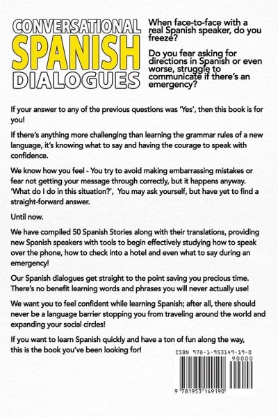 When face-to-face with a real Spanish speaker, do you freeze? Do you fear not knowing how to ask for directions in Spanish or even worse, struggle to communicate if there's an emergency? If your answer to any of the previous questions was 'Yes', then this book is for you! If there's anything more challenging than learning the grammar rules of a new language, it's knowing what to say and having the courage to speak with confidence. We know how you feel - You always try to avoid making embarrassing mistakes or not getting your message through correctly, but it will happen anyway. 'How do I get out of this situation?', You may ask yourself, but have yet to find a straight-forward answer. Until now. We have compiled 50 Spanish Stories along with their translations, providing new Spanish speakers with the necessary tools to begin effectively studying how to set a meeting, how to check into a hotel and even what to say during an emergency! Our Spanish dialogues get straight to the point saving you precious time. There's no benefit learning words and phrases you will never actually use! If you want to learn Spanish quickly and have a ton of fun along the way, this is the book you have been looking for! How Conversational Spanish Dialogues works:Each new chapter will have a fresh, new story between two or more people who wish to solve a common, day-to-day problem that you will most likely experience in real life. A Spanish version of the conversation will take place first, followed by an English translation. This ensures that you fully understood just what it was that they were saying! Before and after the main section of the book, we shall provide you with an introduction and conclusion that will offer you important strategies, tips and tricks to allow you to get the absolute most out of this learning material. That's about it! Simple, useful and incredibly helpful; you will NOT need another conversational Spanish book once you have started reading and studying this one! Focus on getting from zero to conversationally fluent, so you can:Travel or live in Spain or any Spanish speaking country without relying on Google Translate Join Spanish conversations with your Spanish speaking coworkers, friends, or family members Date Spanish-speakers without embarrassing yourself Stop getting passed over for jobs or promotions for less-qualified people who are bilingual We want you to feel confident while learning Spanish; after all, there should never be a language barrier stopping you from traveling around the world and expanding your social circles! So look no further! Scroll back up, click "Add to Cart" and get your copy of Conversational Spanish Dialogues to start learning Spanish right now!