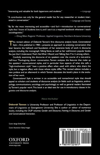 This revised edition of Tannen's first discourse analysis book--first published in 1984--presents an approach to analyzing conversation that later became the hallmark and foundation of her extensive body of work in discourse analysis.