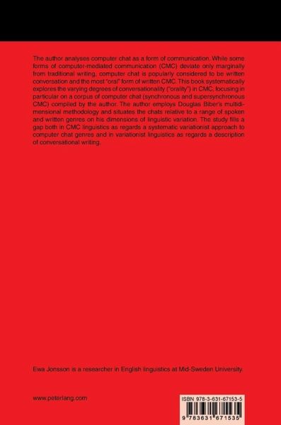 The author analyses computer chat as a form of communication. While some forms of computer-mediated communication (CMC) deviate only marginally from traditional writing, computer chat is popularly considered to be written conversation and the most "oral" form of written CMC. This book systematically explores the varying degrees of conversationality ("orality") in CMC, focusing in particular on a corpus of computer chat (synchronous and supersynchronous CMC) compiled by the author. The author employs Douglas Biber's multidimensional methodology and situates the chats relative to a range of spoken and written genres on his dimensions of linguistic variation. The study fills a gap both in CMC linguistics as regards a systematic variationist approach to computer chat genres and in variationist linguistics as regards a description of conversational writing.