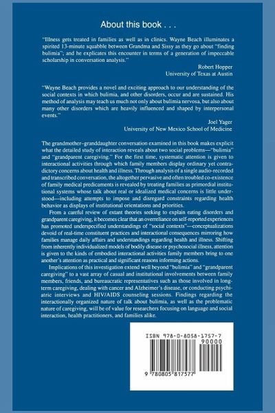 The grandmother granddaughter conversation examined in this book makes explicit what the detailed study of interaction reveals about two social problems--"bulimia" and "grandparent caregiving." For the first time, systematic attention is given to interactional activities through which family members display ordinary yet contradictory concerns about health and illness: * a grandmother's (who is also a registered nurse) attempts to initiate, confront, and remedy her granddaughter's lack of responsibility in admitting bulimic "problems" and committing to professional medical assistance; * a granddaughter's methods for avoiding ownership of the alleged bulimic problems by discounting the legitimacy of her grandmother's expressed concerns. Through analysis of a single audio-recorded and transcribed conversation, Wayne Beach reveals the altogether pervasive and often troubled talk surrounding family medical predicaments. From a careful review of extant theories that seek to explain eating disorders and grandparent caregiving, it becomes clear that an overreliance on self-report data has promoted underspecified understandings of "social contexts" -- conceptualizations void of real time practices and interactional consequences mirroring how families manage their daily affairs and understandings regarding health and illness. In contrast, this volume draws attention to family members' embodied interactional activities. Here it is seen, for example, how methods for expressing concern and caring by individuals may nevertheless eventuate in interactional troubles and problems between family members. The analysis reveals that, while displays of basic concerns for others' health and well being are routine occurrences between family members in home environments -- and of course, across friendship and various support networks -- even the delicate and well-intended management of such occasions guarantees neither agreement on the nature of the alleged "problems" nor, consequently, a commitment to seek professional help as a means of remedying a medical condition. In such cases, the very existence of an illness is itself a matter of some contention to be interactionally worked out. And it is perhaps both predictable and symptomatic that those explicitly denying (or as with the granddaughter, indirectly failing to admit) that problematic health behaviors exist, also somehow let it be made known that far too much attention is being given to possibilities and consequences of illness in the first instance. Implications of this investigation extend well beyond "bulimia" and "grandparent caregiving" to a vast array of casual and institutional involvements between family members, friends, and bureaucratic representatives such as those involved in long-term caregiving, dealing with cancer and Alzheimer's disease, or conducting psychiatric interviews and HIV/AIDS counseling sessions. Findings regarding the interactionally organized nature of talk about bulimia, as well as the problematic nature of caregiving, will be of value to researchers focusing on language and social interaction, health practitioners, and families alike. This volume includes the full transcript of the conversation in the case study. A copy of the audio-recording is available for classroom adoption and/or personal purchase by contacting: Wayne A. Beach, School of Communication, San Diego State University, San Diego, CA 92182-4516.