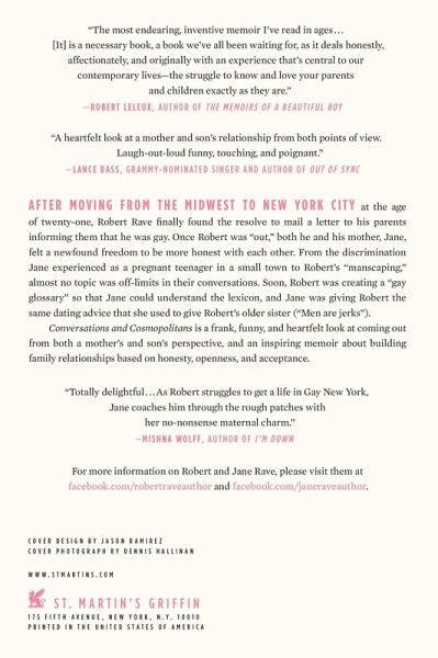 Part Augusten Burroughs, part Robert Leleux, Conversations and Cosmopolitans is a hilarious and touching memoir written by a mother, Jane, and her son, Robert, as they navigate their new relationship together after Robert announces in a hand-written letter that he is gay. After moving from the Midwest to New York City at the age of twenty-one, Robert Rave finally found the resolve to mail a letter to his parents informing them that he was gay. Once Robert was "out," both he and his mother Jane felt a newfound freedom to be more honest with each other. From the discrimination Jane experienced as a pregnant teenager in a small town, to Robert's "manscaping," almost no topic was off-limits in their conversations. Soon, Robert was creating a "gay glossary" so that Jane could understand the lexicon and Jane was giving Robert the same dating advice that she used to give Robert's older sister ("men are jerks"). CONVERSATIONS AND COSMOPOLITANS is a frank, funny, and heartfelt look at coming out from both a mother's and son's perspective, and an inspiring memoir about building family relationships based on honesty, openness, and acceptance.