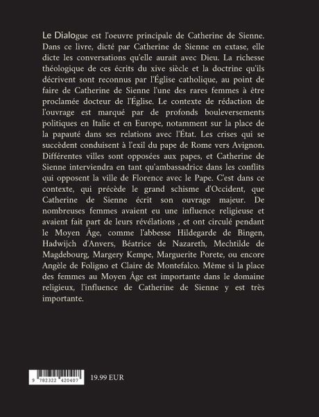 Le Dialogue est l'oeuvre principale de Catherine de Sienne. Dans ce livre, dicté par Catherine de Sienne en extase, elle dicte les conversations qu'elle aurait avec Dieu. La richesse théologique de ces écrits du xive siècle et la doctrine qu'ils décrivent sont reconnus par l'Église catholique, au point de faire de Catherine de Sienne l'une des rares femmes à être proclamée docteur de l'Église. Le contexte de rédaction de l'ouvrage est marqué par de profonds bouleversements politiques en Italie et en Europe, notamment sur la place de la papauté dans ses relations avec l'État. Les crises qui se succèdent conduisent à l'exil du pape de Rome vers Avignon. Différentes villes sont opposées aux papes, et Catherine de Sienne interviendra en tant qu'ambassadrice dans les conflits qui opposent la ville de Florence avec le Pape. C'est dans ce contexte, qui précède le grand schisme d'Occident, que Catherine de Sienne écrit son ouvrage majeur. De nombreuses femmes avaient eu une influence religieuse et avaient fait part de leurs révélations , et ont circulé pendant le Moyen Âge, comme l'abbesse Hildegarde de Bingen, Hadwijch d'Anvers, Béatrice de Nazareth, Mechtilde de Magdebourg, Margery Kempe, Marguerite Porete, ou encore Angèle de Foligno et Claire de Montefalco. Même si la place des femmes au Moyen Âge est importante dans le domaine religieux, l'influence de Catherine de Sienne y est très importante.