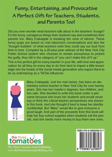 Funny, Entertaining, and ProvocativeA Perfect Gift for Teachers, Students, and Parents Too! Did you ever wonder what teachers talk about in the teachers' lounge? It's the funny, outrageous things their students say and sometimes their parents too. Mary Crabapple is breaking the cone of silence. These funny quips are based on real classroom conversations and also the "thought bubbles" of what teachers wish they could say out loud from time to time. Compiled by a twenty-plus-year veteran of the New York City Public School system who chooses to remain anonymous to protect the guilty, they fall in the category of "you can't make this sh*t up." This is the perfect gift for every teacher in your life, with love and appreciation for all they do every day to do their best to impart a little knowledge into the heads of the social media generation who expect them to be as entertaining as a TikTok influencer.