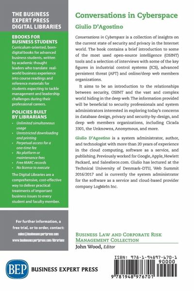 Conversations in Cyberspace is a collection of insights on the current state of security and privacy in the Internet world. The book contains a brief introduction to some of the most used open-source intelligence (OSINT) tools and a selection of interviews with some of the key figures in industrial control systems (ICS), advanced persistent threat (APT) and online/deep web members organizations. It aims to be an introduction to the relationships between security, OSINT and the vast and complex world hiding in the deep web. The information provided will be beneficial to security professionals and system administrators interested in exploring today's concerns in database design, privacy and security-by-design, and deep web members organizations, including Cicada 3301, the Unknowns, Anonymous, and more.