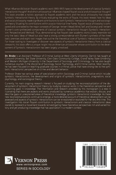 Dr. Brake is an Assistant Professor of Criminal Justice at West Liberty University. Darrick has taught at Concord University, Ball State University, Glen Oaks Community College, Grand Valley State University, and Western Michigan University in the Department of Sociology and Criminology. He has also taught numerous courses in the discipline of Sociology, Social Psychology, and Criminal Justice. Most recently, he has been focused on teaching graduate courses in criminal justice that have strong ties to the symbolic interactionist perspective on crime and deviant behavior. Professor Brake has various areas of specialization within Sociology and Criminal Justice which include: symbolic interactionism, the development and origins of symbolic interactionism, pragmatism, social psychology, and sociological theory. Currently, his main ongoing research interest is focused on studying the reconceptualization of the development of symbolic interactionist theory by studying classical works in the theoretical perspective and explaining gaps in knowledge. The information and research provided by this monograph is a step in illustrating that there are aspects and works produced by numerous academics that explain, discuss, and describe gaps or unexplained areas of theoretical knowledge, symbolic interactionist knowledge. As these new reconceptualizations continue to emerge, a more detailed account of theoretical development can be assessed and aspects of symbolic interactionism can be re-explored or explored for the very first time. This investigation into Josiah Royce's contribution to symbolic interactionism and classical interactionist ideas stands to represent a movement towards reinvestigating these theoretical perspectives rich and varied history and yet producing knowledge that has application in a modern context.