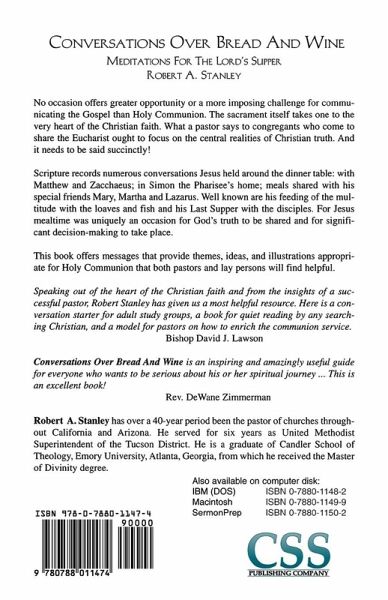 No occasion offers greater opportunity or a more imposing challenge for communicating the gospel than Holy Communion. The sacrament itself takes one to the very heart of the Christian faith. What a pastor says to congregants who come to share the Eucharist ought to focus on the central realities of Christian truth. And it needs to be said succinctly! Scripture records numerous conversations Jesus held around the dinner table: with Matthew and Zacchaeus; in Simon the Pharisee's home; meals shared with his special friends Mary, Martha, and Lazarus. Well known are his feeding of the multitude with the loaves and fish and his Last Supper with the disciples. For Jesus mealtime was uniquely an occasion for God's truth to be shared and for significant decision-making to take place. This book offers messages that provide themes, ideas, and illustrations appropriate for Holy Communion that pastors and lay persons will find helpful. Speaking out of the heart of the Christian faith and from the insights of a successful pastor; Robert Stanley has given us a most helpful resource. Here is a conversation starter for adult study groups, a book for quiet reading by any searching Christian, and a model for pastors on how to enrich the communion service. Bishop David I. Lawson Conversations Over Bread And Wine is an inspiring and amazingly useful guide for everyone who wants to be serious about his or her spiritual journey... This is an excellent book! Rev. DeWane Zimmerman Robert A. Stanley has over a 40-year period been the pastor of churches throughout California and Arizona. He served for six years as United Methodist Superintendent of the Tucson District. He is a graduate of Candler School of Theology, Emory University, Atlanta, Georgia, from which he received the Master of Divinity degree.