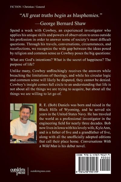 Over the course of a week and the recollections of a lifetime, the investigative consultant known only as Cowboy strives to close the gap between religion and common sense. What are God's intentions, the meaning of life, and the secret to happiness? What is it that makes each of us so unique? These are the questions Cowboy seeks to answer-and in doing so, R. E. Daniels' novel intends to show us readers, too, where to look for those answers. Conversations with a Wild Man asks of readers one question, though it's hardly simple to answer: how special are you? By demonstrating his own unique perspective through Cowboy's story, Daniels also talks about how important his readers' perspectives are to everyone else. Those asking the great questions-and who aren't afraid of the answers they might receive-will find in Conversations with a Wild Man a book that discovers the greatest revelations.