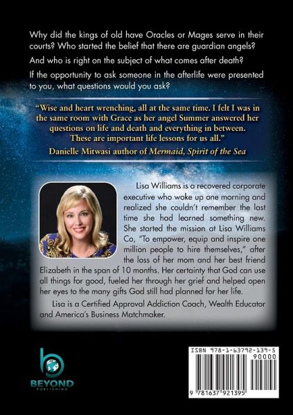 Why did the kings of old have Oracles or Mages serve in their courts? Who started the belief that there are guardian angels? And who is right on the subject of what comes after death? If the opportunity to ask someone in the afterlife were presented to you, what questions would you ask? "Wise and heart wrenching, all at the same time. I felt I was in the same room with Grace as her angel Summer answered her questions on life and death and everything in between. These are important life lessons for us all." Danielle Mitwasi author of Mermaid, Spirit of the Sea Lisa Williams is a recovered corporate executive who woke up one morning and realized she couldn't remember the last time she had learned something new. She started the mission at Lisa Williams Co, "To empower, equip and inspire one million people to hire themselves," after the loss of her mom and her best friend Elizabeth in the span of 10 months. Her certainty that God can use all things for good, fueled her through her grief and helped open her eyes to the many gifts God still had planned for her life. Lisa is a Certified Approval Addiction Coach, Wealth Educator and America's Business Matchmaker.
