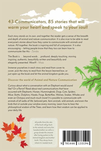 Discover the world of Animal and Nature Communication! This anthology is a collection of stories from 43 Nature Communicators of all experience levels that were hand-picked to inspire and awaken the reader to the wonderful world of Animal + Nature Communication! From stories that dive into finding your soul's purpose to communicating with crops to help the farmers, this Book contains a wide variety of stories from start to finish. Have you ever wondered if you could converse with an animal or plant? The truth is that you can and this Book contains helpful suggestions to aid your journey along the way, and profound parables that have the potential to transform your life in ways you never knew were possible. Curious about what a conversation with an Elephant would sound like? Or a Parrot? Read about real communications that have occurred with Elephants, Horses, Hummingbirds, Dogs, Cats, Spiders, Mice, Sloths, Dolphins, Hawks, Frogs, Butterflies, Wolves, Snakes, Whales and even an Octopus and much much more! It is possible to communicate with animals of all walks of life; beloved pets, farm animals, wild animals, and even the birds that sit outside your window every morning. Learn how to hear the philosophical wisdom of the Trees, and learn how their wisdom can be applied to your daily life. Do you wish you could converse with a pet who has previously crossed the Rainbow Bridge? This anthology addresses the beauty of life and what it is like for Animals to transition. The natural world shares profound wisdom with us on a daily basis, and each of these conversations have the capacity to transform the ways that we as humans perceive and live our lives.